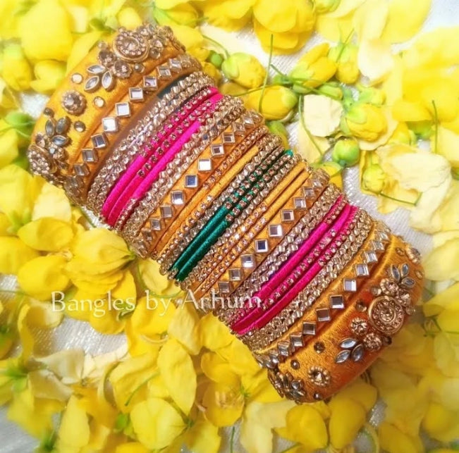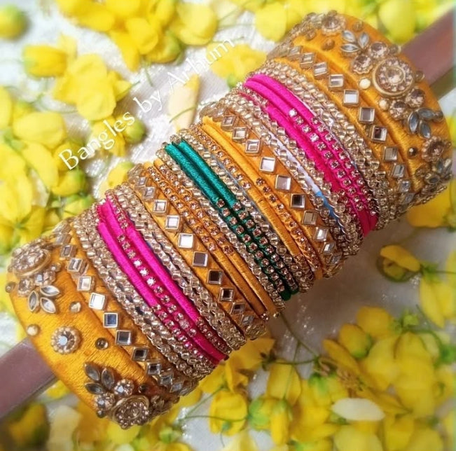 "Made with silk thread bangles featuring kundan, small pearls, and a unique crystals design! Elevate your style with these exquisite pieces and radiate charm on any occasion. 💫